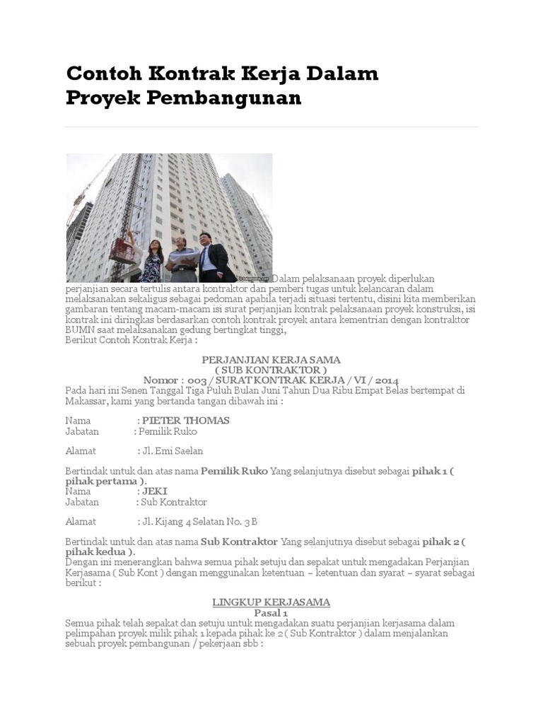 Surat Perjanjian Kerja Pembangunan Apartemen from imgv2-2-f.scribdassets.com Banyak contoh surat kontrak kerja yang berlaku dalam sebuah perusahaan. Namun tidak sembarang proyek dapat menggunakan surat kerja sama ini hal ini tergantung dengan instansi proyek yang anda ajak untuk bekerja sama. Selain itu, setelah kontrak akan segera habis, anda harus memperbaruinya, dengan cara mengangkat karyawan. Surat perjanjian kontrak kerja proyek pembangunan rumah tinggal pada hari ini, kamis tanggal enam september tahun dua ribu sembilan, yang bertanda tangan di bawah ini: Biasanya, kontrak kerja tersebut berlaku untuk waktu tertentu maupun waktu tidak tertentu. Baik melalui tender, antara pihak owner/client dan kontraktor akan terikat dalam sebuah kontrak kerja. Kesepakatan kerja atau kontrak kerja merupakan sebuah perjanjian yang dilakukan oleh pekerja dengan perusahaan yang dilakukan secara lisan atau tulisan. Pengangkatan status dalam sebuah perusahaan juga selalu ditandai dengan adanya surat perjanjian kontrak kerja yang sudah dipengaruhi.